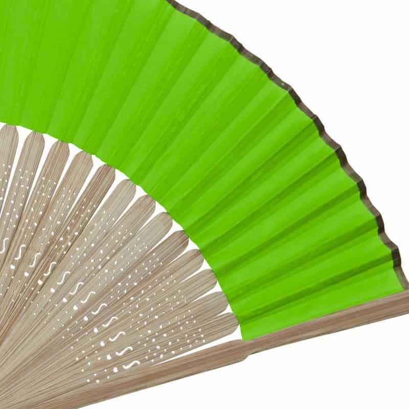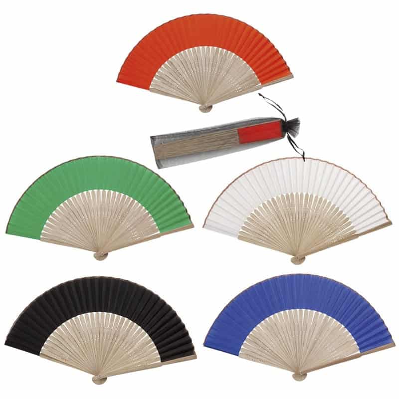 - Abanico con varillas de bambú, presentado en bolsa de organza. Varios colores.