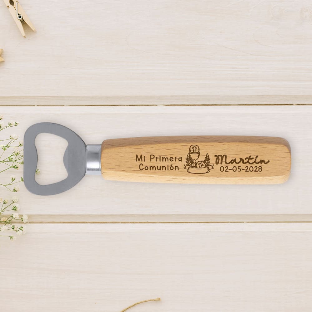 El día de la Primera Comunión es un momento lleno de significado y alegría. Quieres que cada detalle sea perfecto, incluyendo el obsequio para tus invitados. Nuestro abridor de madera personalizado comunión es la elección ideal si buscas combinar elegancia, simbolismo y funcionalidad. Es un recuerdo de primera comunión que se aleja de lo convencional y que tus familiares y amigos usarán con cariño, rememorando siempre ese día tan importante.