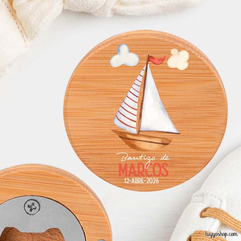 - Abridor para bautizo personalizado, bambú, con imán, modelo barquito