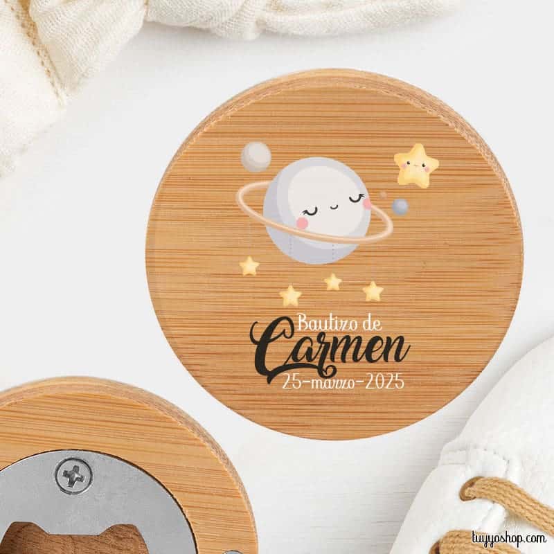- Abridor para bautizo personalizado, bambú, con imán, modelo moon