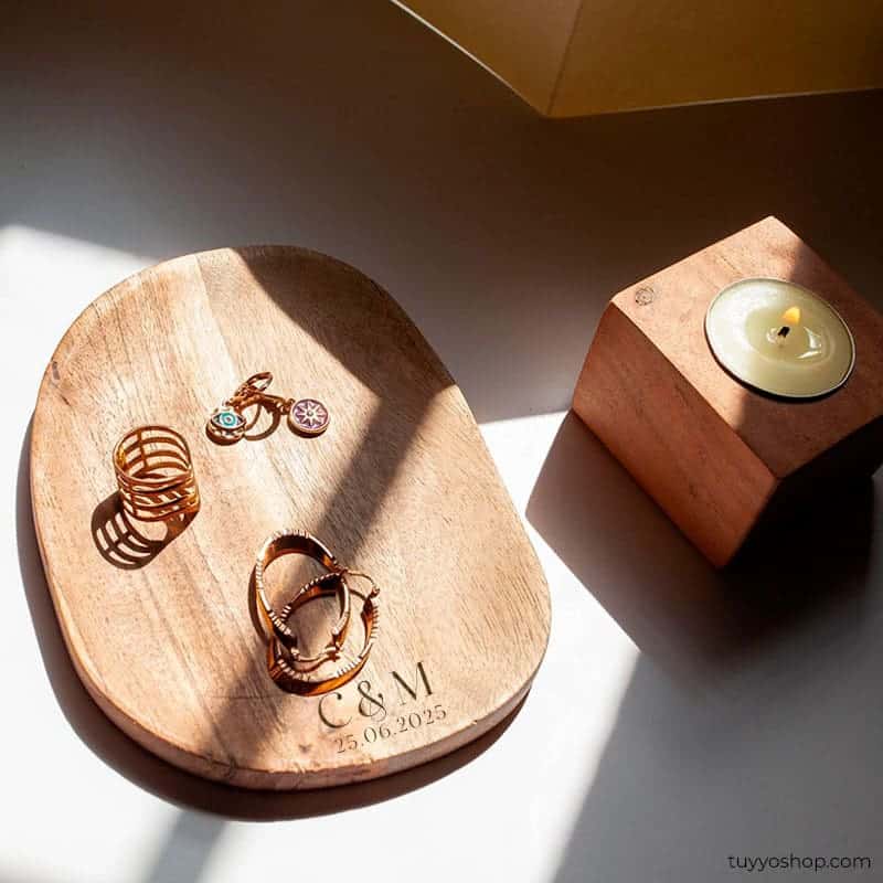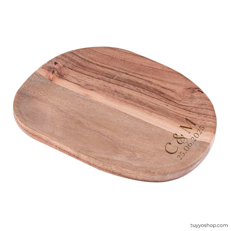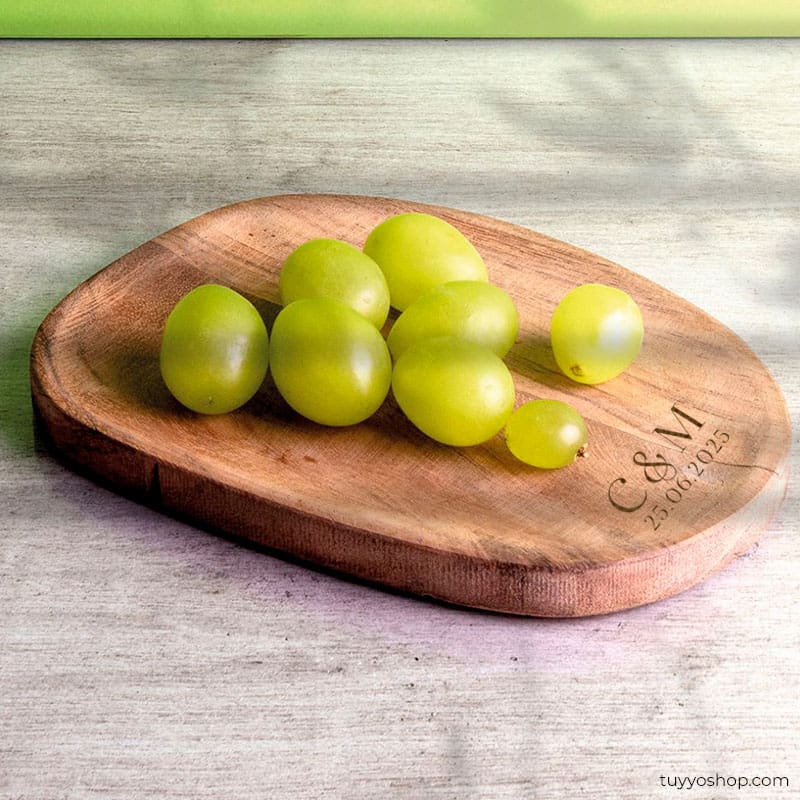 - Personalización Exclusiva: Cada bandeja es personalizada con un grabado sobre la madera que incluye las iniciales de los novios, añadiendo un toque único y personal.