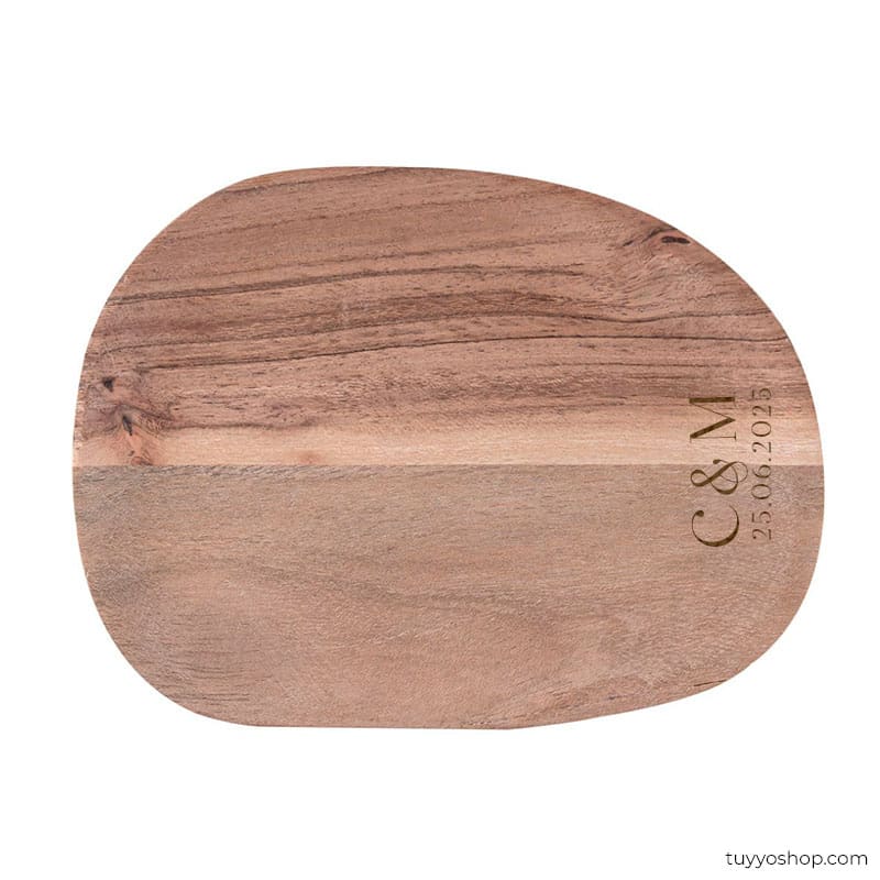 Las bandejas de madera personalizadas son una excelente manera de añadir un toque de sofisticación y personalización a tu celebración. Nuestra bandeja, fabricada en madera de acacia y grabada con las iniciales de los novios, es un detalle de boda que tus invitados apreciarán y conservarán para siempre.