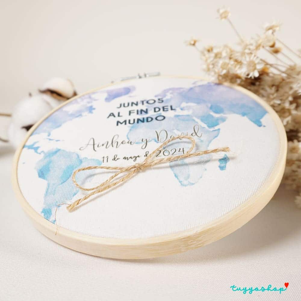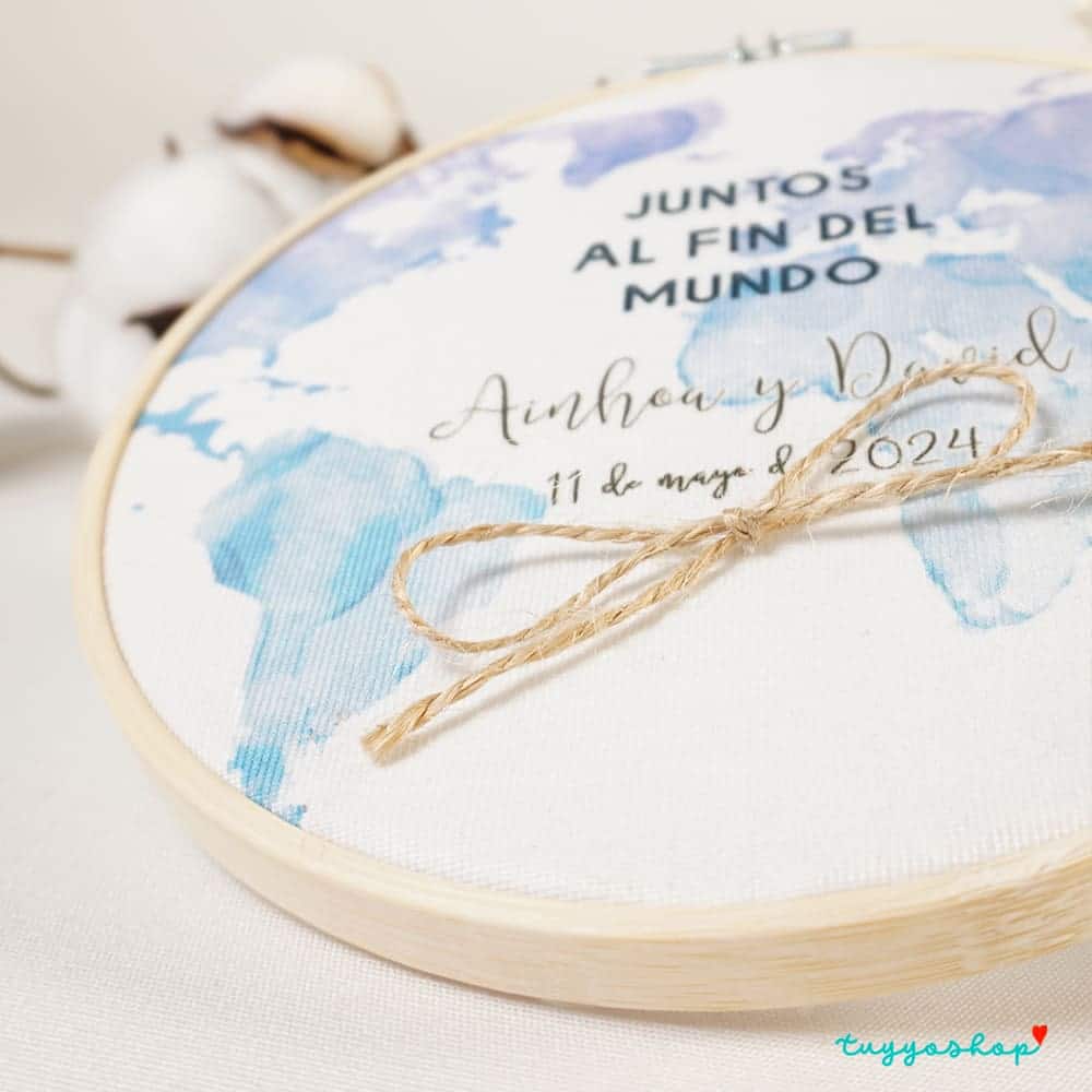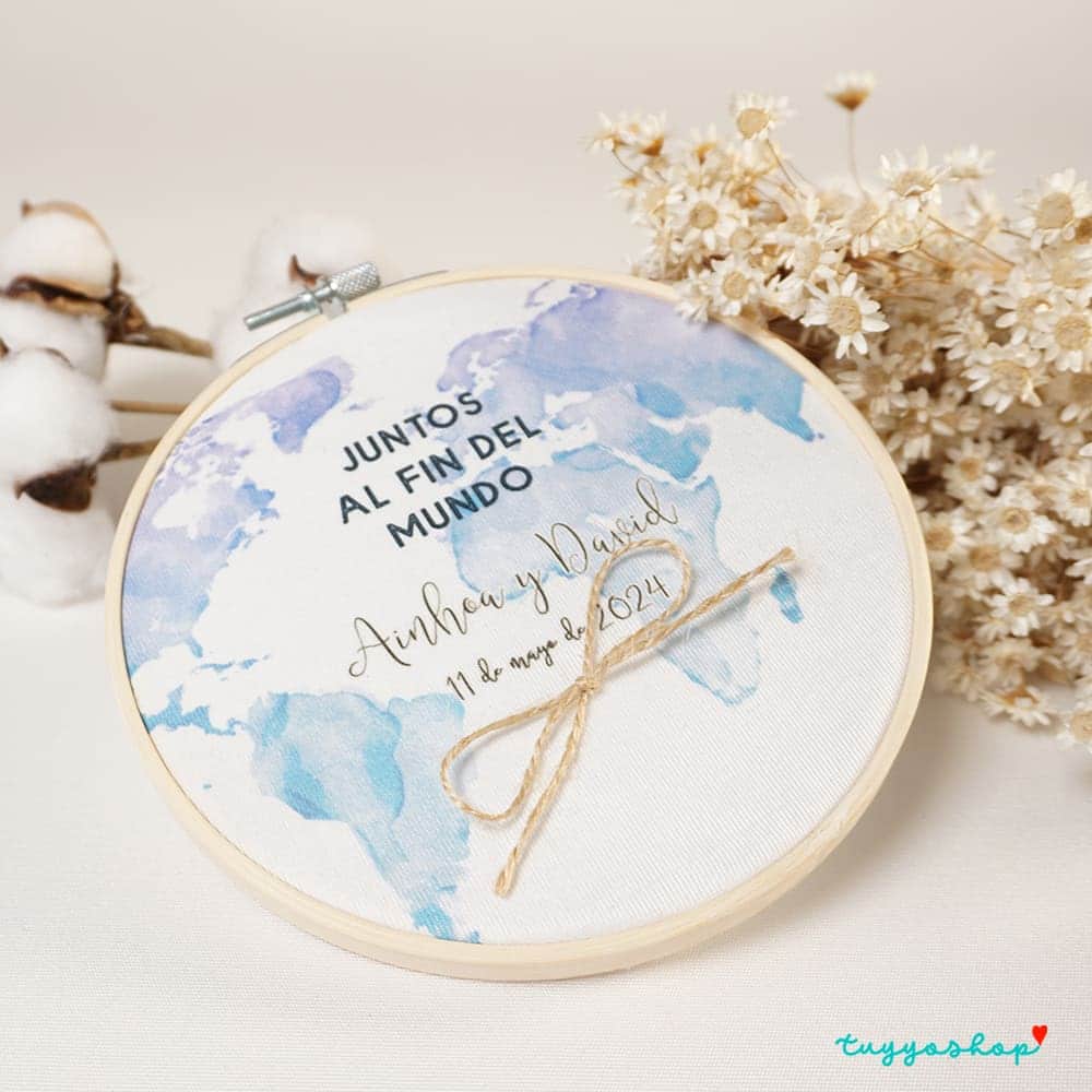 Original porta alianza para personalizar tu boda a un nivel único. Un bonito diseño en un bonito bastidor. Impreso a todo color sobre tela en tacto de algodón. Lo puedes personalizar con vuestros nombres y la fecha del evento.