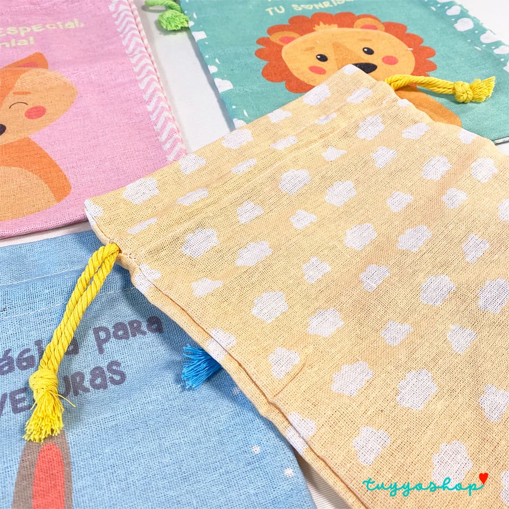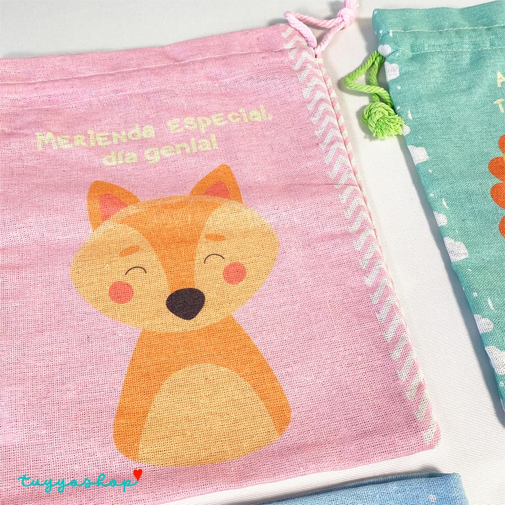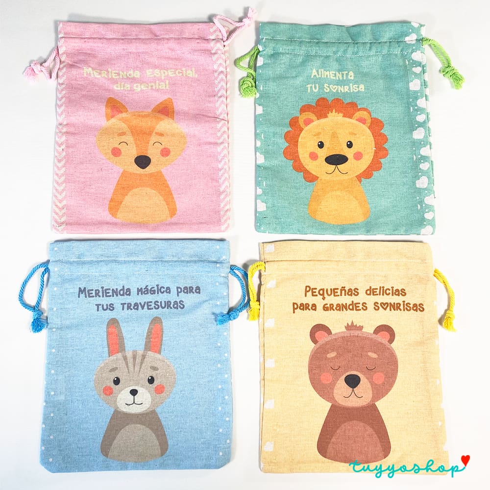 Bolsa merienda Animales del Bosque. Un práctico regalo para los más peques de tu evento. Una bolsa que podrán utilizar para ir al cole, a la guardería, al parque, de excursión, a la piscina,… Gustará mucho a los pequeños y no tan pequeños de tu evento por ser muy práctica. Realizada en tela de algodón y con cierre mediante cuerda, es un detalle con un estampado precioso en colores pastel.