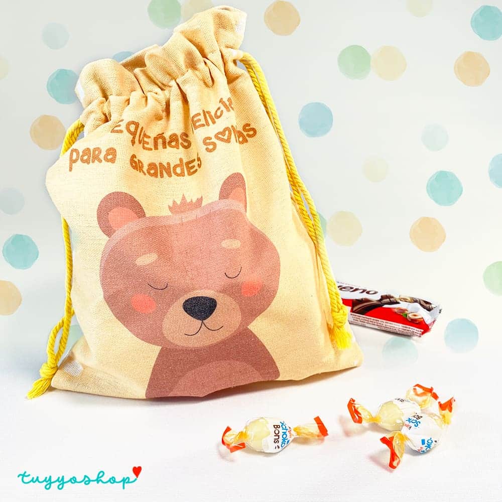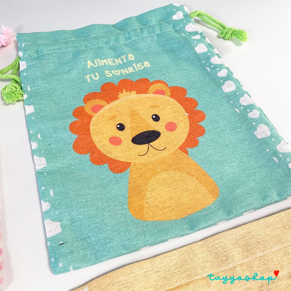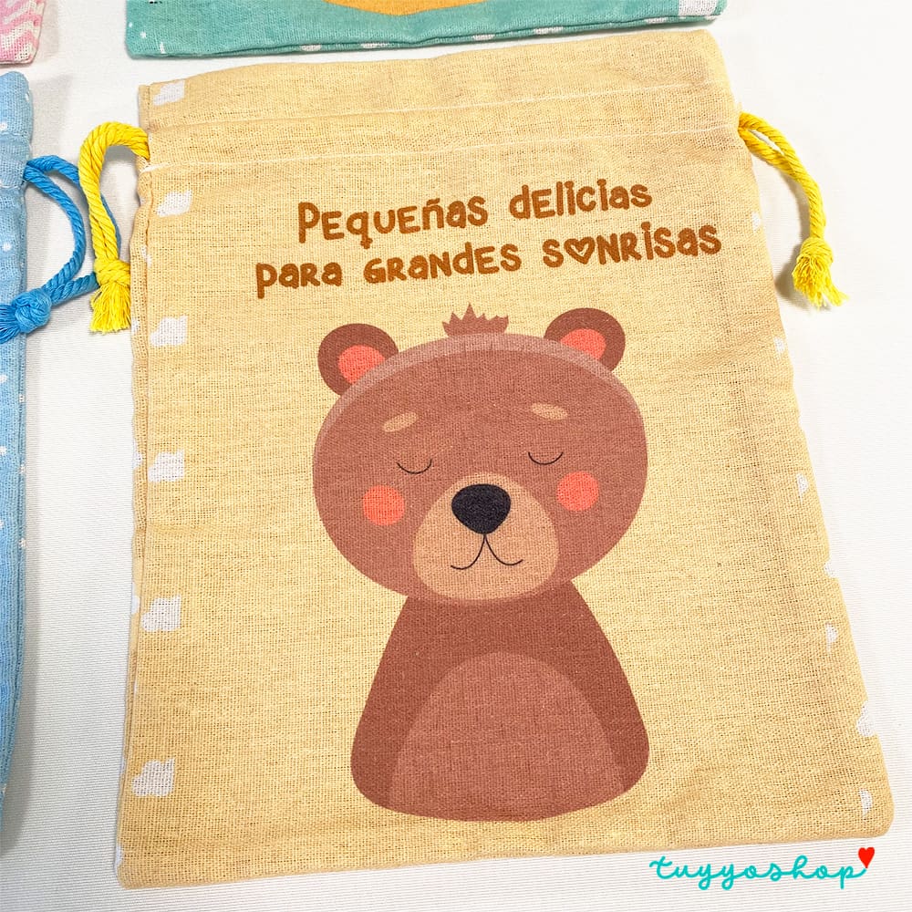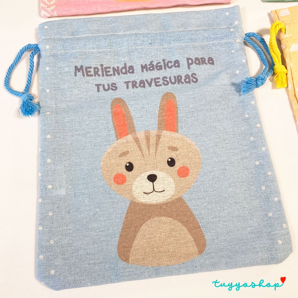 Bolsa merienda Animales del Bosque. Un práctico regalo para los más peques de tu evento. Una bolsa que podrán utilizar para ir al cole, a la guardería, al parque, de excursión, a la piscina,… Gustará mucho a los pequeños y no tan pequeños de tu evento por ser muy práctica. Realizada en tela de algodón y con cierre mediante cuerda, es un detalle con un estampado precioso en colores pastel.