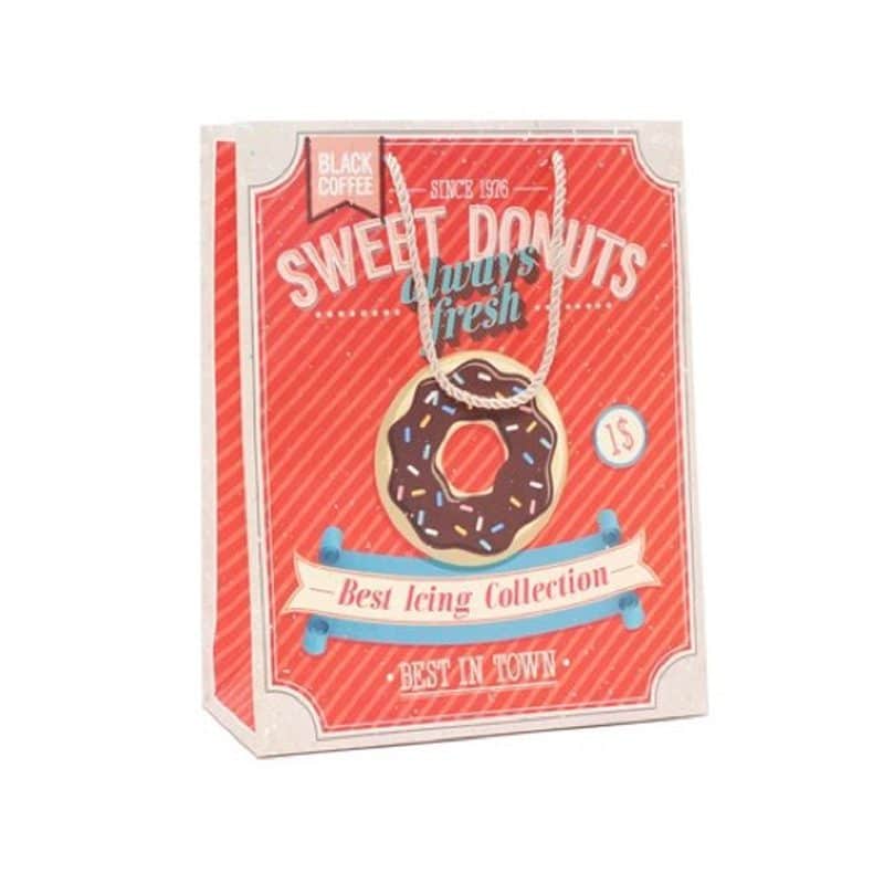 Bolsa papel detalles boda con diseño vintage inspirado en donuts. El modelo es único y muy original. Es una bolsa grande y muy resistente. Lleva un asa de cuerda en color blanco.