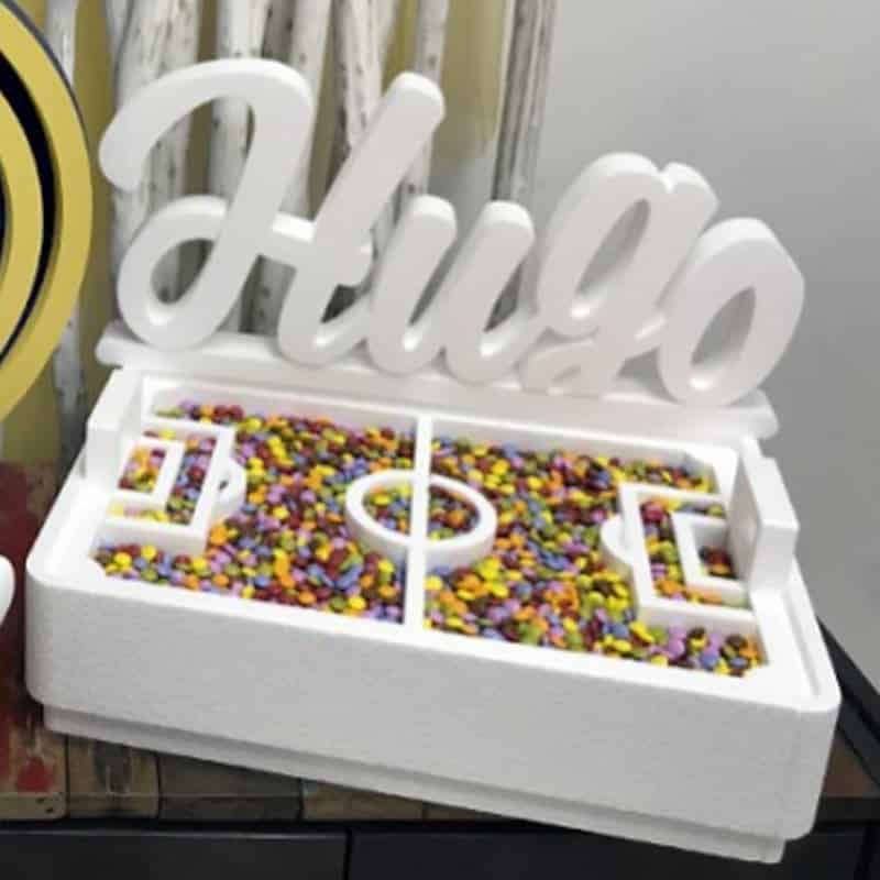 Si a tu pequeño/a le gusta el fútbol, no te puedes perder este campo de fútbol. Perfecto para presentar las chuches más deliciosas. Además incluye el nombre con lo que lo puedes hacer todavía más personalizado.