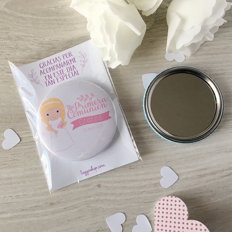- Chapa espejo para comunión, modelo chica presentado en bolsita de celofán.