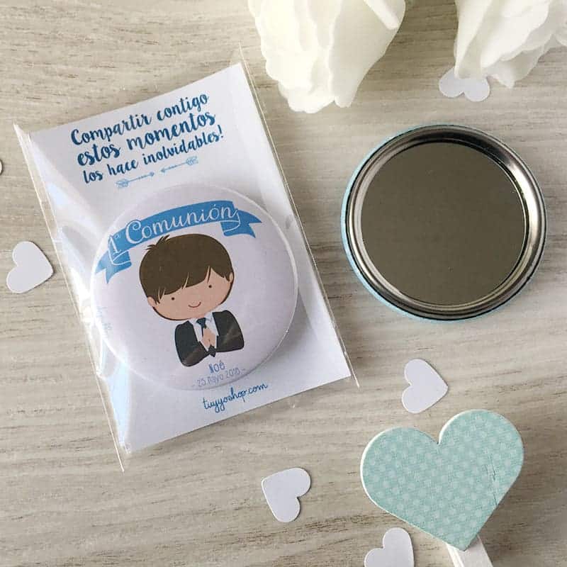 - Chapa espejo para comunión, modelo chico presentado en bolsita de celofán.