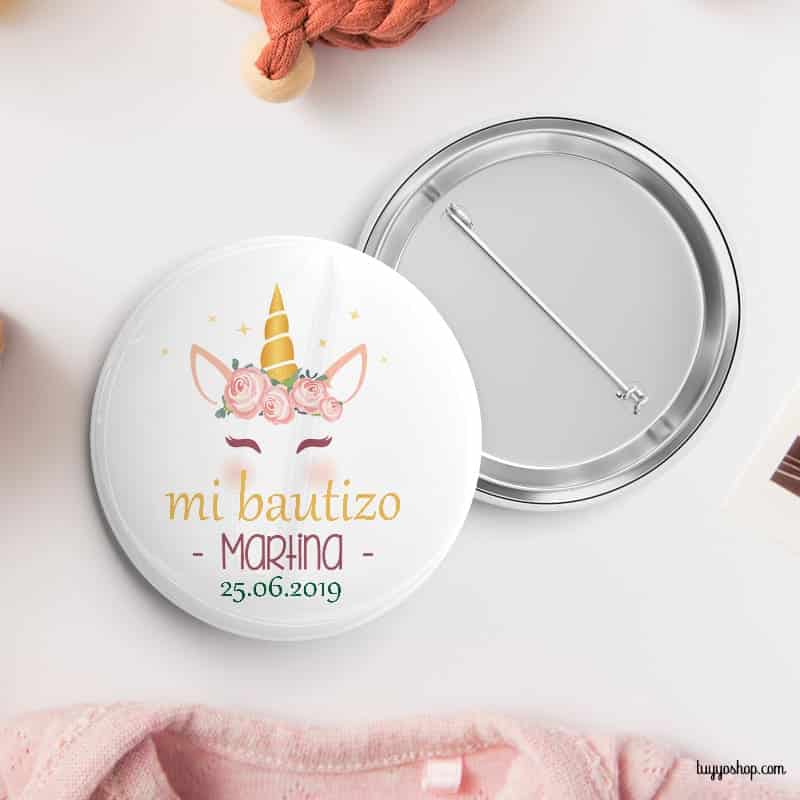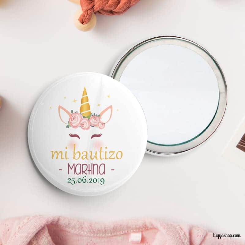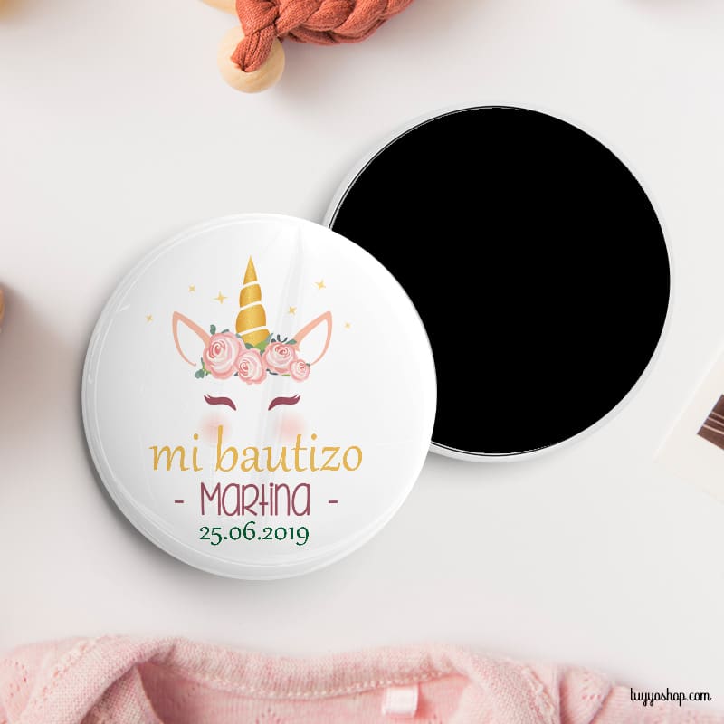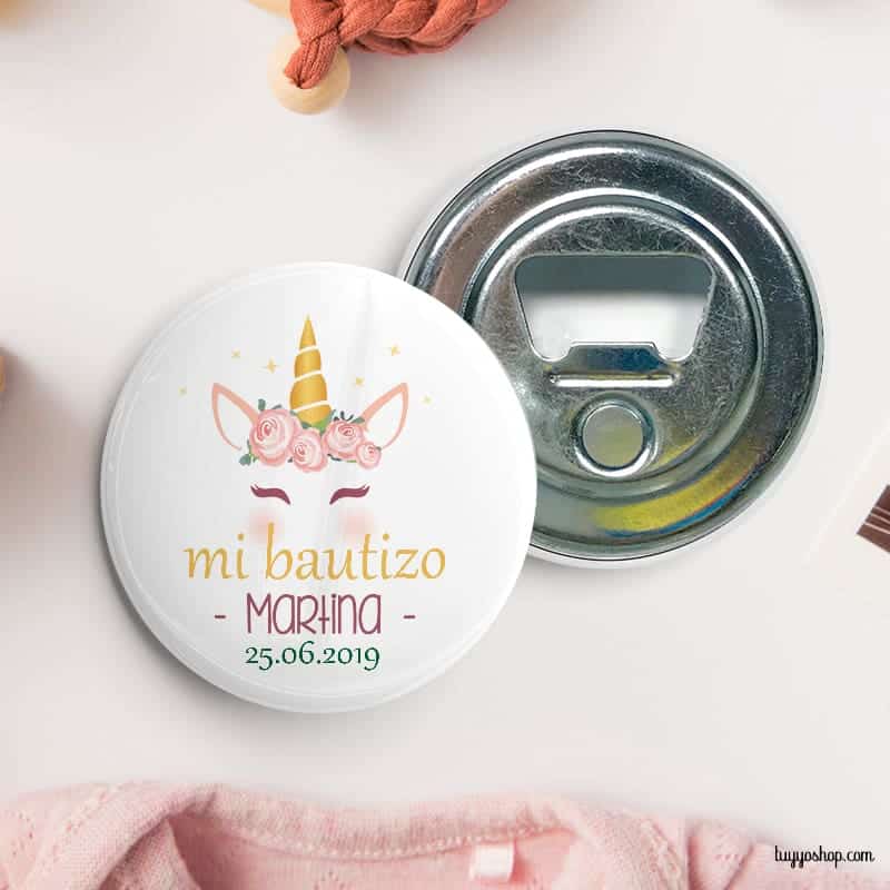 - Chapa personalizada para bautizo. Glitter Unicornio. Imperdible, abridor, espejo, imán