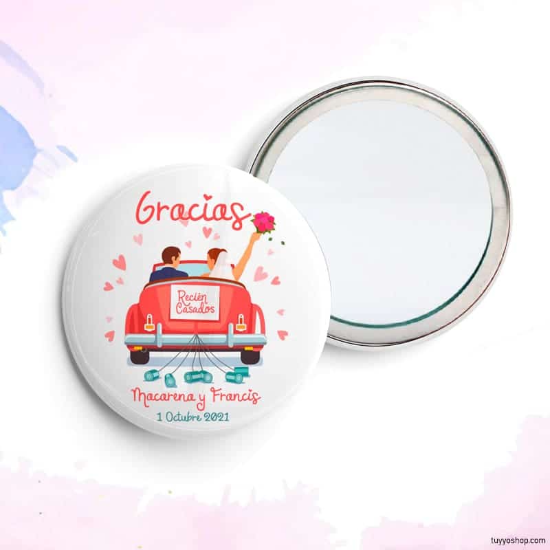 Chapa personalizada para boda, recién casados. Abridor imán, espejo, imperdible o imán.