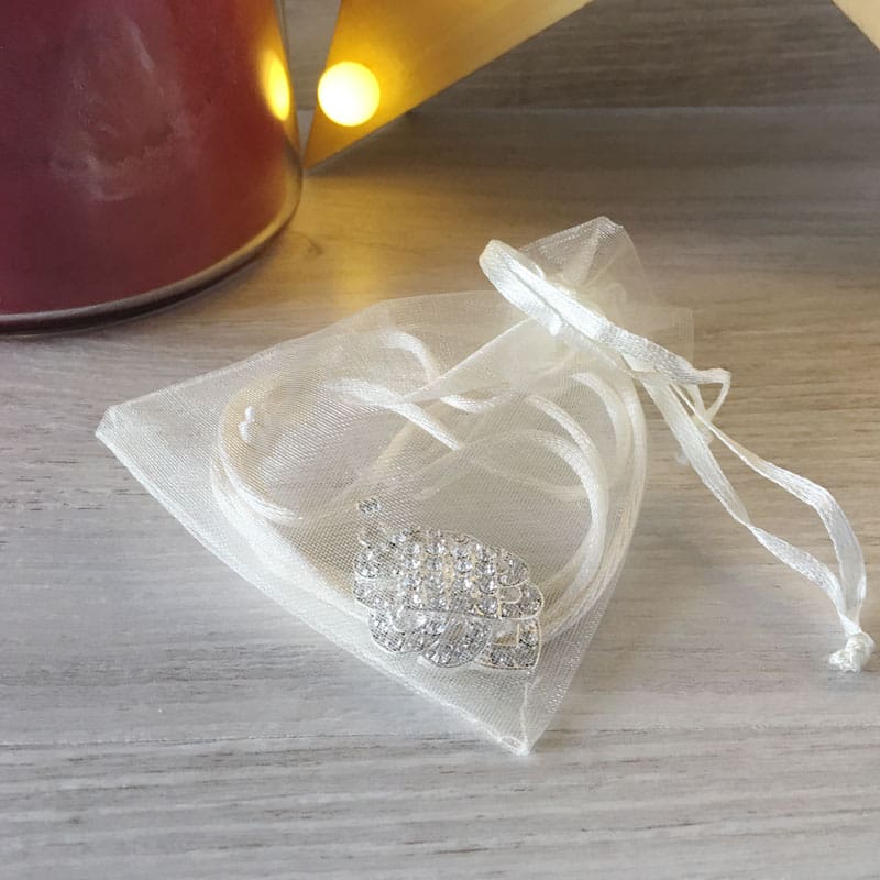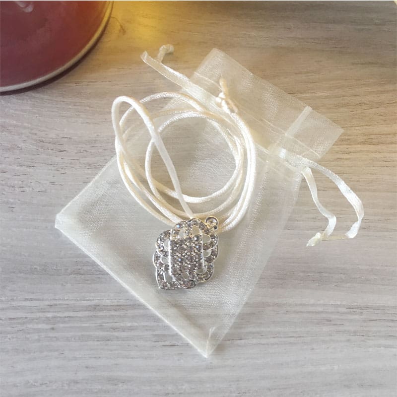 Este colgante strass, es el regalo más completo que puedes regalar. Viene en bolsita de organza color marfil, listo para ser entregado. Que mejor detalle para agradecerles especialmente que te acompañen en ese día tan especial como es tu boda. Ellas quedarán encantadas y tu satisfecha de la elección.