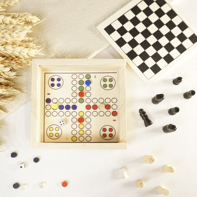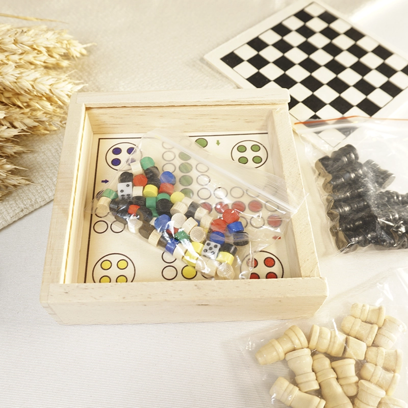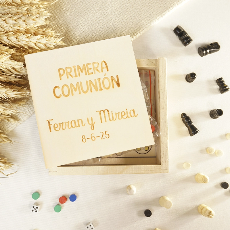 Conjunto de 3 juegos en caja de madera. Los juegos clásicos despiertan y entrenan el cerebro de los más pequeños, así que si buscas un regalo para niños diferente y que desarrolle su mente, con estos juegos acertarás. Además son perfectos para interactuar entre ellos y fomentar el compañerismo. Un regalo original y bonito presentado en una cajita de madera natural del mismo material que las fichas.