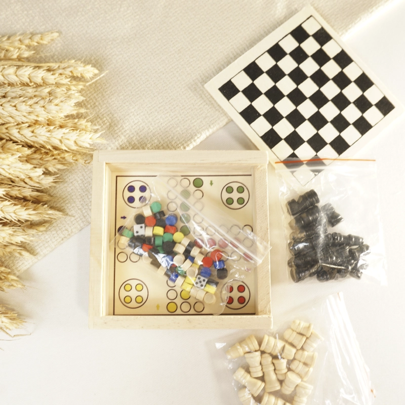 Conjunto 3 juegos en caja de madera. 12.5x3x12.5cm