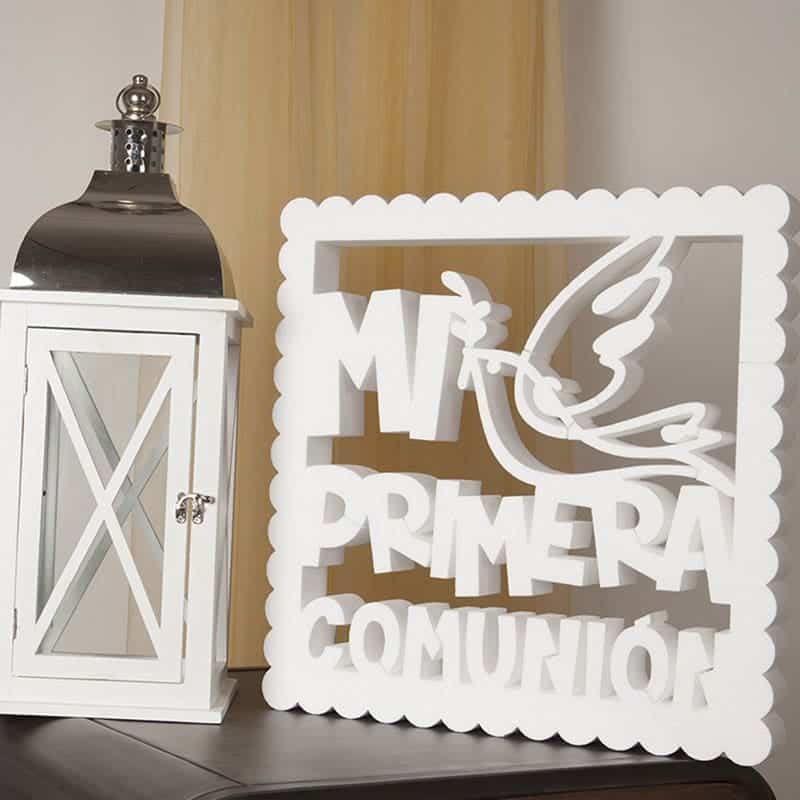 Corcho con el texto “Mi primera comunión” en color blanco. Bonito elemento decorativo que está siendo todo un éxito de ventas. Incluye una paloma decorativa. Está fabricando en porexpan de alta densidad. Aguanta perfectamente golpes y caídas.