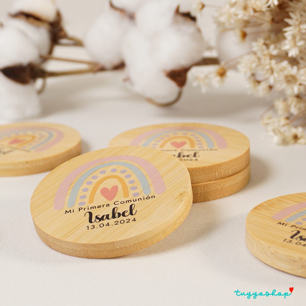 Espejo para comunión personalizado, una cara, bambú. Diseño arcoíris
