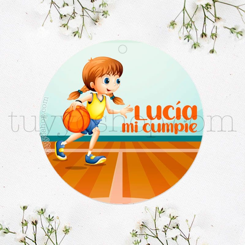 - Etiqueta de cumpleaños Niña jugando a Baloncesto