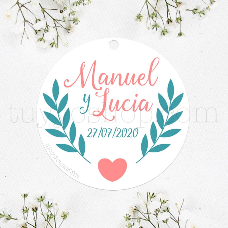 • Etiqueta para detalles de boda con diseño y modelo ramitas y corazón