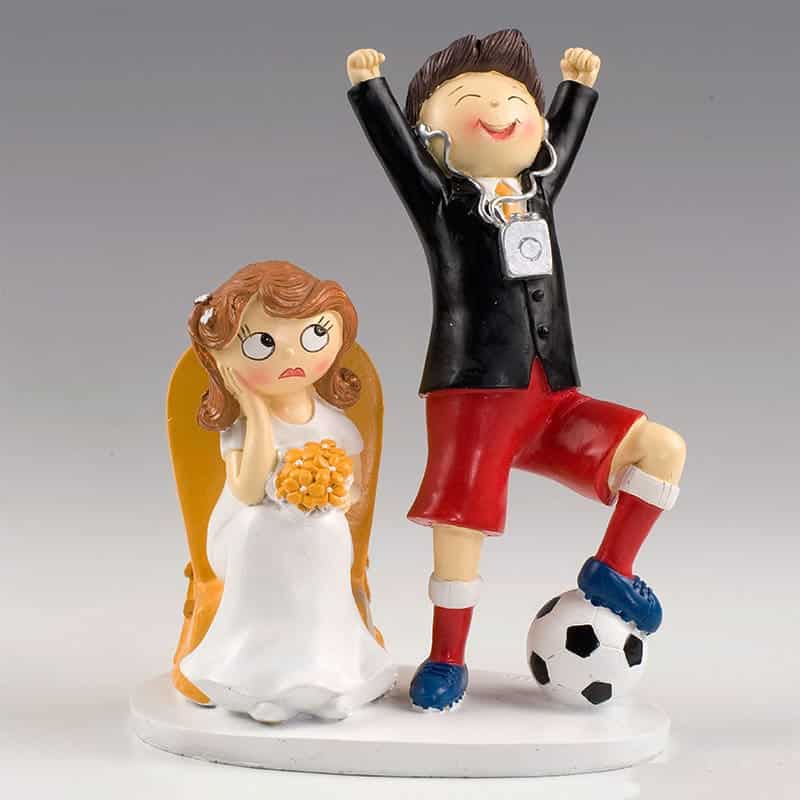Original figura para la tarta de tu boda. Se trata de una pareja de novios donde él lleva un balón y las botas de fútbol. Ella no parece estar muy contenta…! Una figura divertida con la que tendrás un bonito recuerdo. Fabricada en resina de calidad.