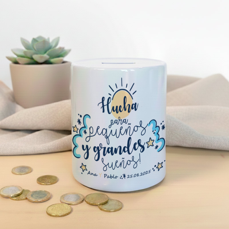 La Hucha Personalizada Bodas no es solo un objeto, es una metáfora tangible de los “Grandes Sueños” que la pareja desea alcanzar. Es un detalle perfecto para regalar a los novios, o incluso para usar como un elemento decorativo y funcional en la recepción de la boda. Gracias a su base con tapón, permite recuperar los ahorros sin necesidad de romperla.