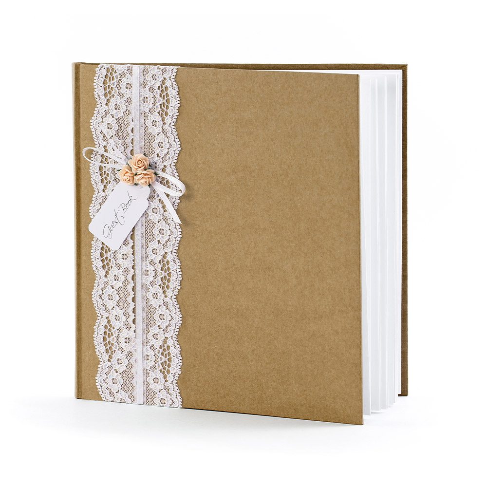 Este elegante libro de firmas para bodas es perfecto para capturar los mensajes y buenos deseos de tus seres queridos en tu día especial. Con un diseño refinado, presenta una cubierta de encaje blanco con delicados detalles en rosa y un hermoso lazo que lo hace destacar. Ideal para una boda romántica, este libro de firmas será un recuerdo preciado que podrás atesorar por siempre.