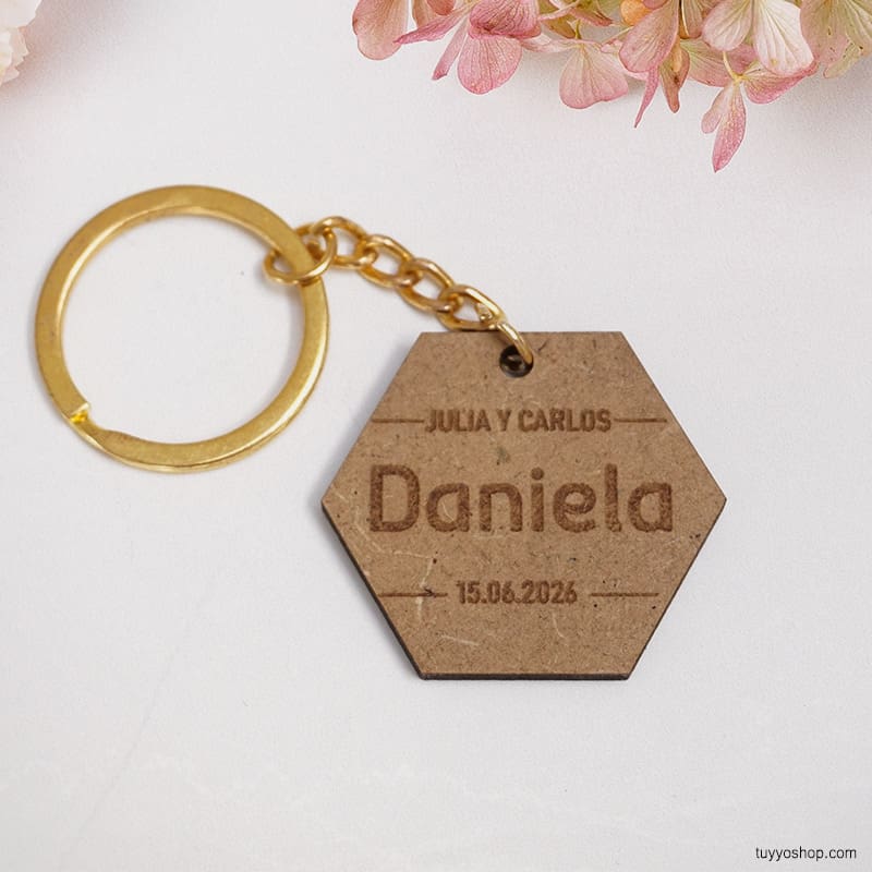Llavero de madera y marcasitios personalizado, hexagonal, 4cm