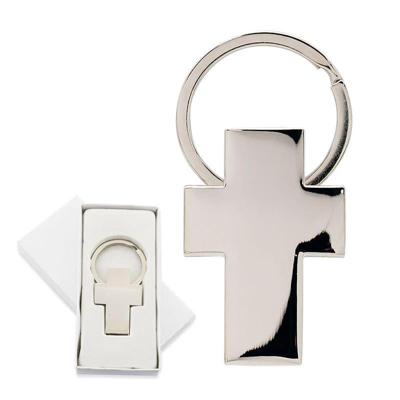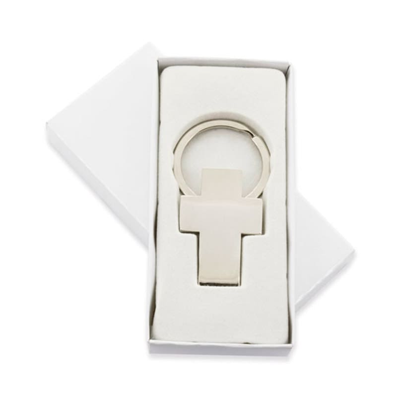 - Llavero para comunión en forma de cruz. Presentado en cajita blanca.