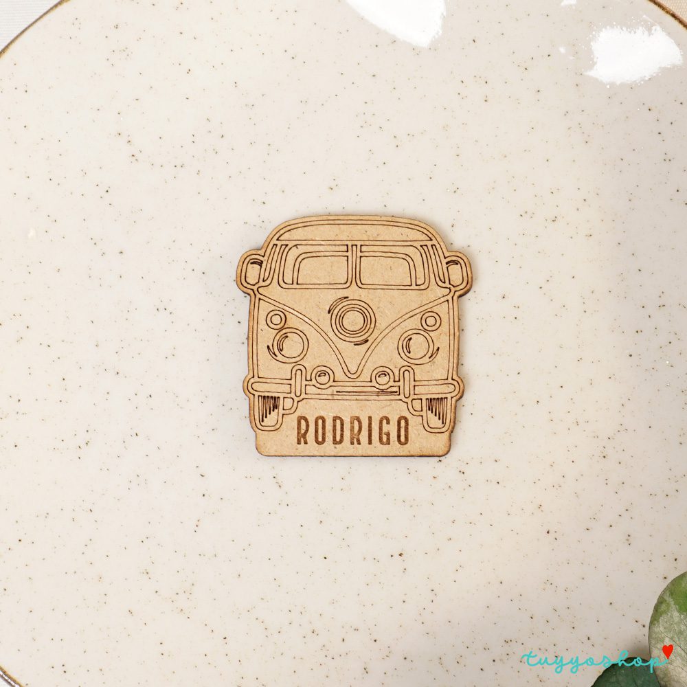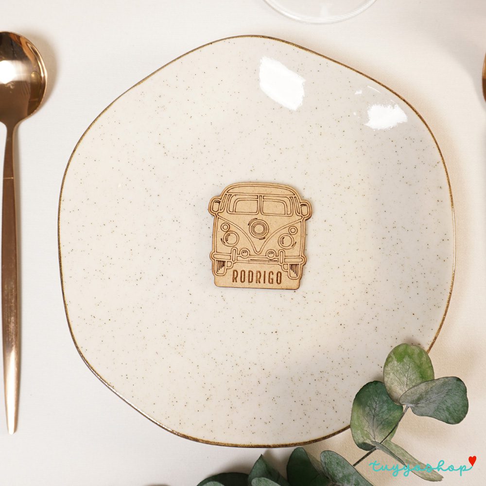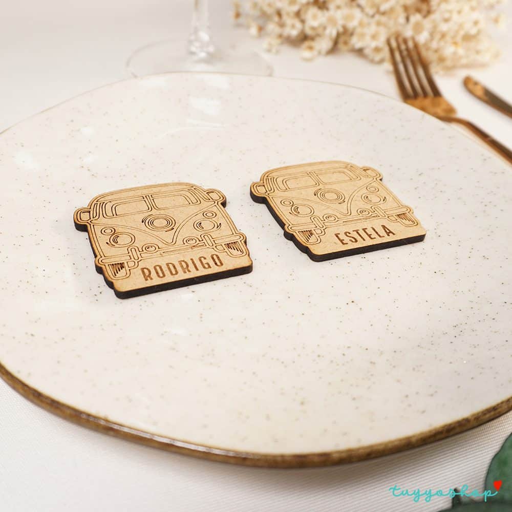 Si lo tuyo es la aventura, este diseño de marcasitio personalizado es lo que buscas. Un original diseño de furgoneta vintage con el nombre de cara invitado, otorgará a la mesa original y un toque informal y divertido. Hazte ya con ellos!