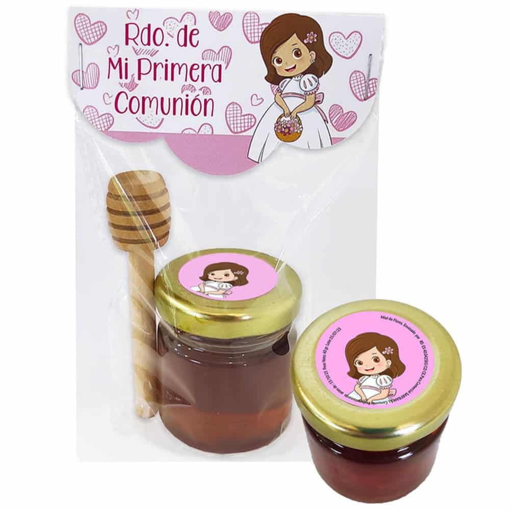 Excelente miel para comunión elaborada en España. 40gr de auténtica salud. Tiene el formato perfecto para regalo y además viene con la etiqueta de una chica vestido de comunión. Es el regalo gourmet que buscabas para entregar el día de tu evento. NO SE PUEDE PERSONALIZAR