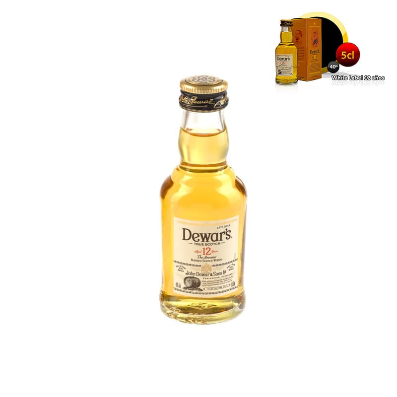 Mini botella whisky White Label en botella de cristal con cajita de cartón. Un buen regalo para los amantes del buen whisky que sin duda sabrán agradecer este regalo. A esta mini botella no le falta detalle y contiene un whisky de 12 años. Toda una bebida gourmet para tus invitados.