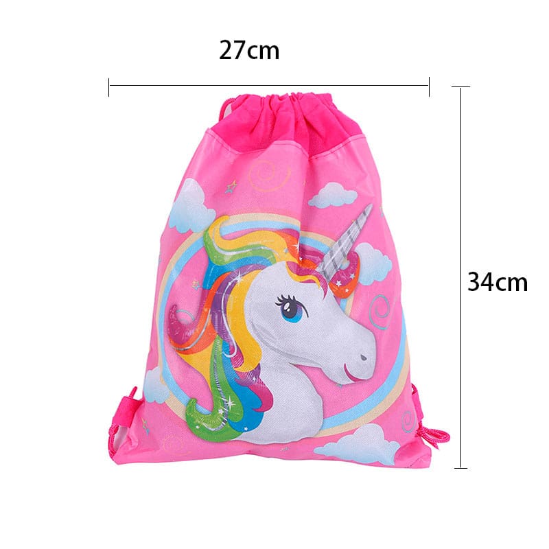 Mochila petate modelo unicornio. Un práctico regalo para los más peques de tu evento, decorada con bonito motivo de unicornios, que tanto está gustando. Una mochila que podrán utilizar para ir al cole, a la guardería, al parque, de excursión, a la piscina,… Por su medida de 27 x 37 cm es la mochila ideal para llevar la merienda, agua, ropa, etc. Gustará mucho a los pequeños y no tan pequeños de tu evento.