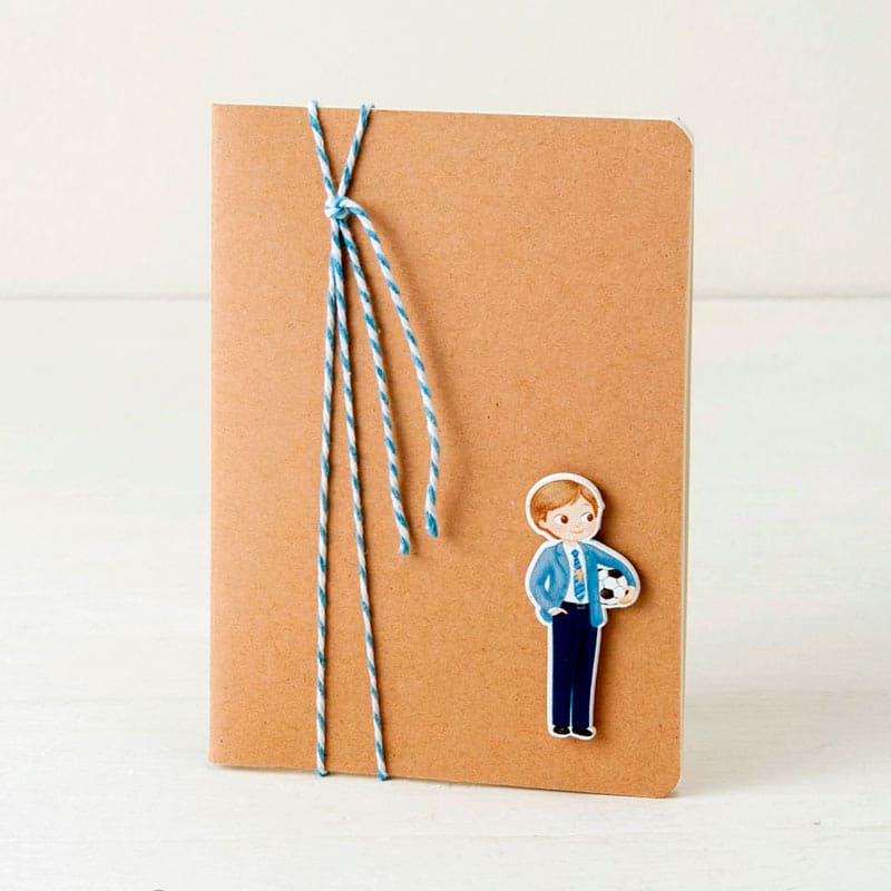Elegante y distintiva libreta kraft con interior de hojas rayado. Perfecta para entregar y marcar la diferencia. Te la entregamos con el adorno del niño de comunión con balón y cordón bicolor azul y blanco como cierre de la libreta. Un original detalle que puede marcar la diferencia. No modificable.