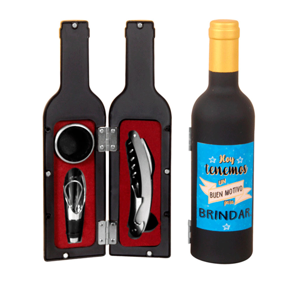 - 3 Piezas: sacacorchos-abridor-navaja, tapón de vino y anilla anti goteo.