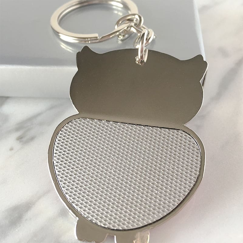¿Buscas un regalo original para los invitados de tu evento? Aquí tienes un llavero totalmente diferente a todo lo demás. Aquí tienes un llavero que además hace la función de lima. Tiene un diseño muy bonito en forma de búho. Fabricado en metal inoxidable, viene presentado en una cajita de color plata brillo. Puedes añadirle una etiqueta de nuestra selección y tendrás el detalle listo para ser entregado a tus invitados. Se sirve surtido.