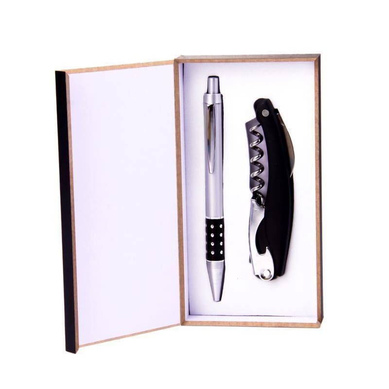 Original set de bolígrafo y abridor sacacorchos presentado en caja de madera.