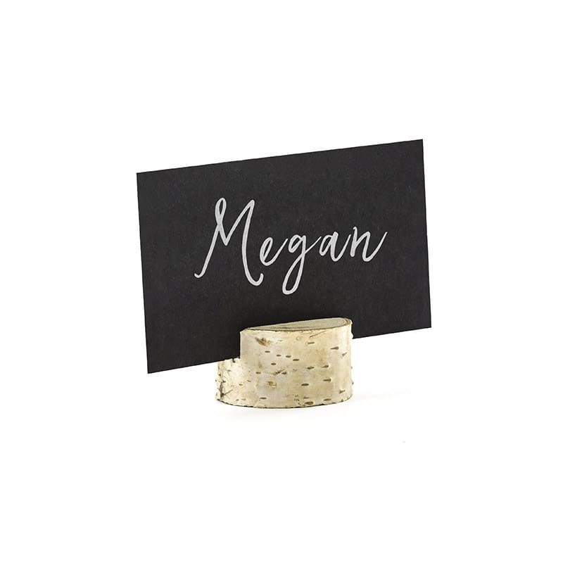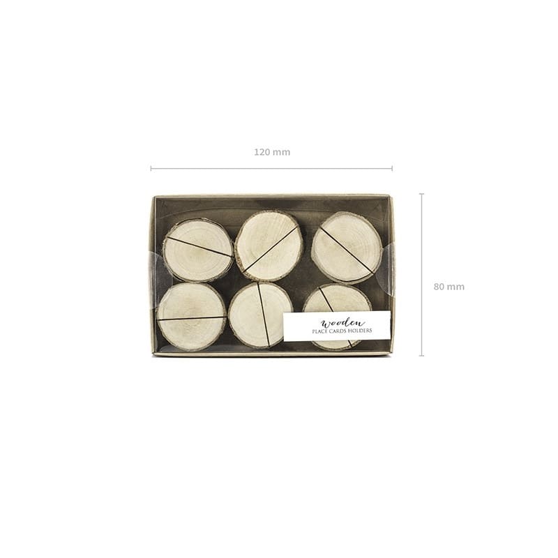 Original pack de 6 lascas de madera ya preparadas para utilizarlas como soporte de tarjetas o meseros. Vienen presentadas en una cajita con las 6 unidades dentro. Al ser un producto artesanal, las medidas no son exactas y varían en cada pieza.
