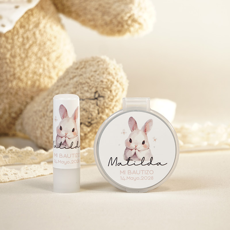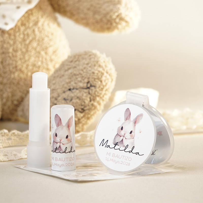 Si buscas un detalle que destaque por su delicadeza, el pack espejo y bálsamo personalizado con diseño Rabbit es la opción perfecta. La temática del conejito es un clásico renovado que evoca ternura y pureza, encajando a la perfección tanto en bautizos de niño como de niña.