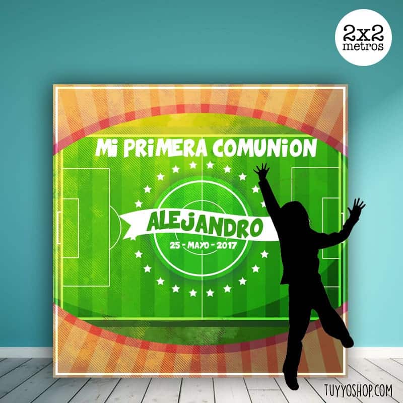 Photocall para comunión diseño campo de fútbol. Ahora puedes tener el photocall para la comunión de tu pequeño. Te ofrecemos la oportunidad de contar en la comunión con uno de los complementos que más gusta a tus invitados. El photocall para comunión es divertido, a todos les gusta hacerse la foto del recuerdo y sobre todo si es original y diferente. Nuestros diseños son totalmente personalizables con el nombre y la fecha del evento.