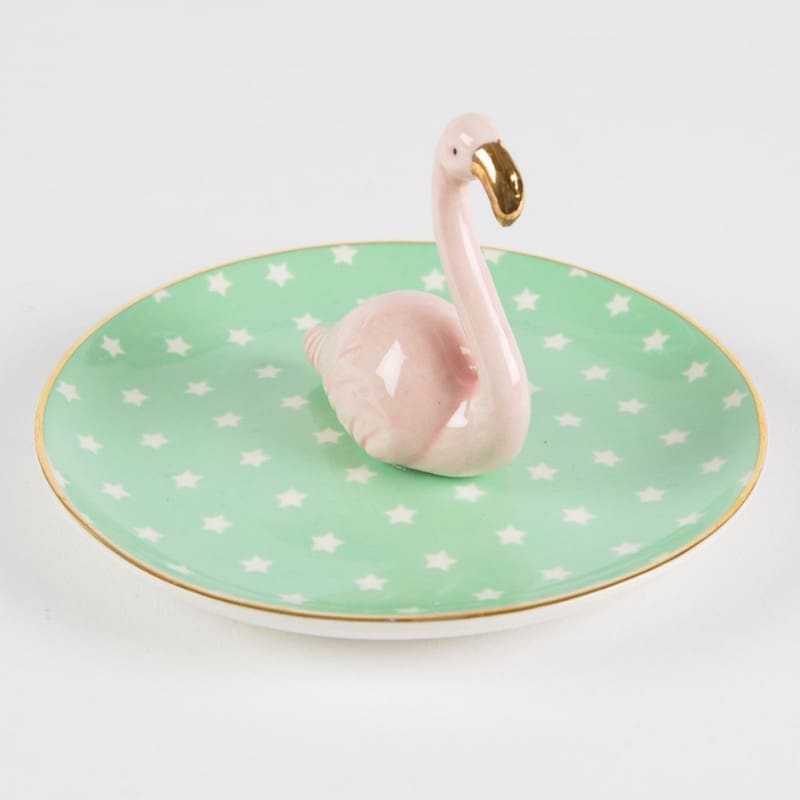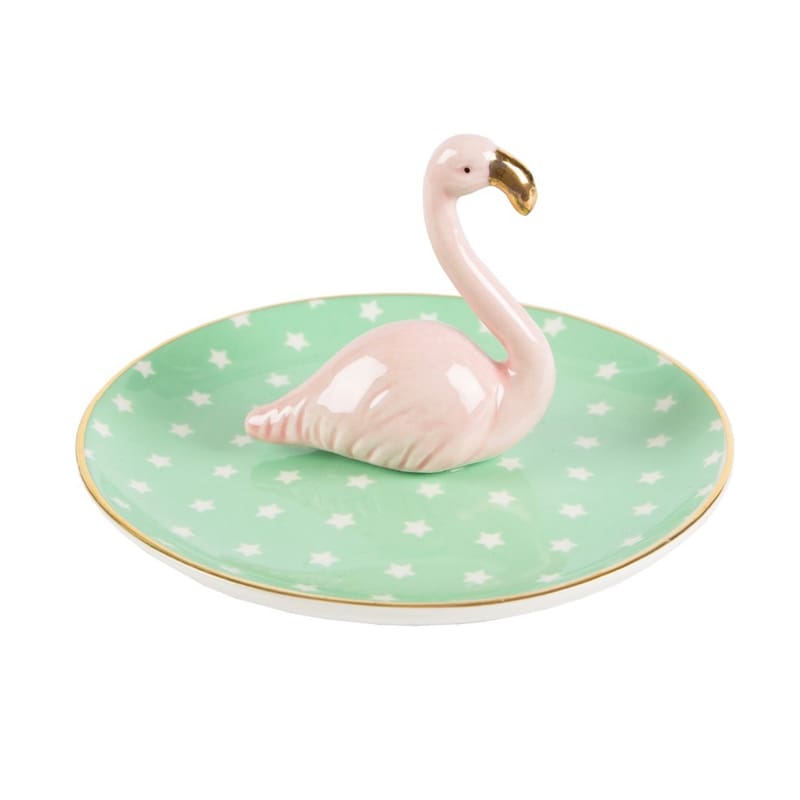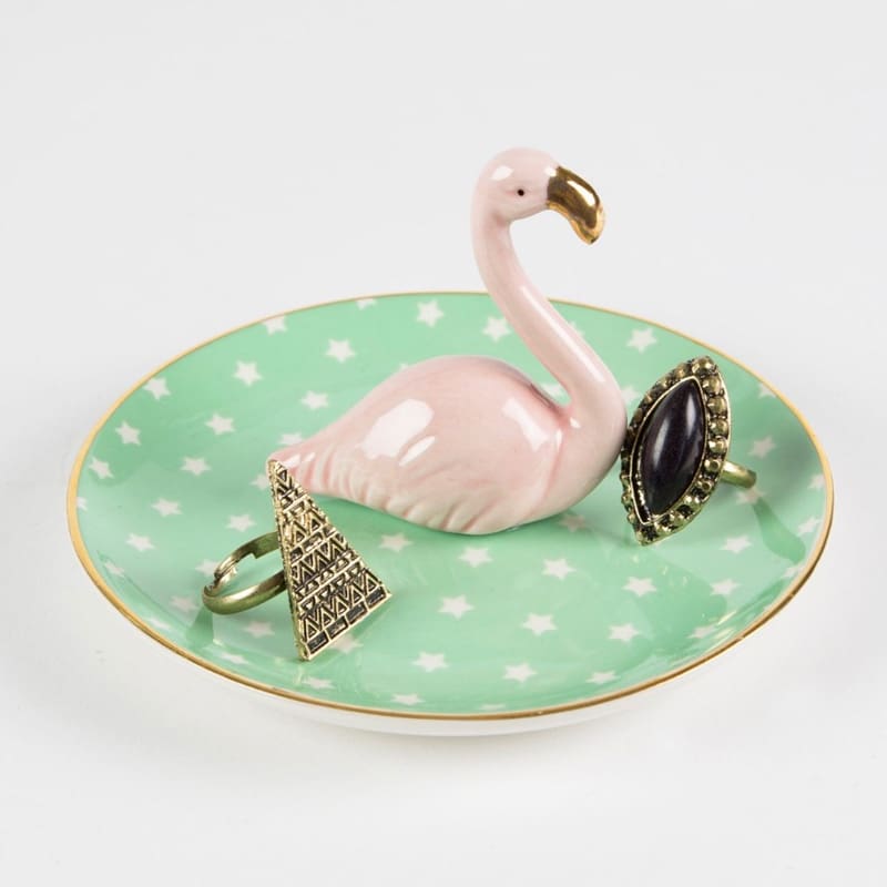 ¿Que tiene de especial este anillero? Tiene un precioso flamenco en el centro! Es tendencia en decoración. El plato tiene un estampado de estrellas blancas sobre fondo verde. Los toques dorados le dan un acabado maravilloso. Un producto peculiar que nos encanta!