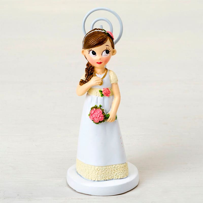 Divertido portafotos elaborado en resina de alta calidad y resistencia. Una chica sonriente vestida para recibir du Primera Comunión. Perfecto para entregar con una foto de tu hijo o con una tarjetita de agradecimiento.