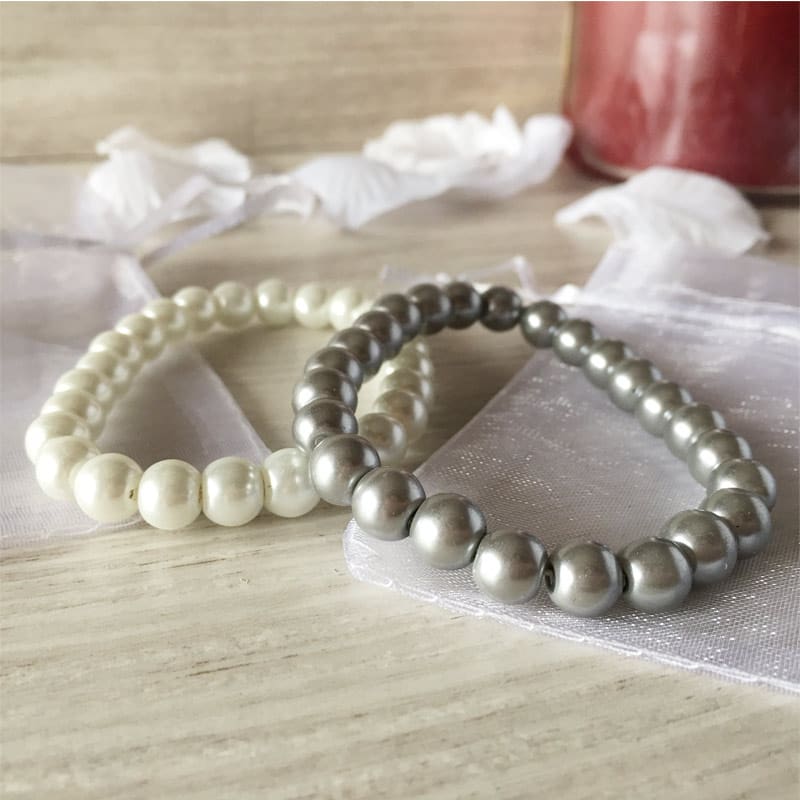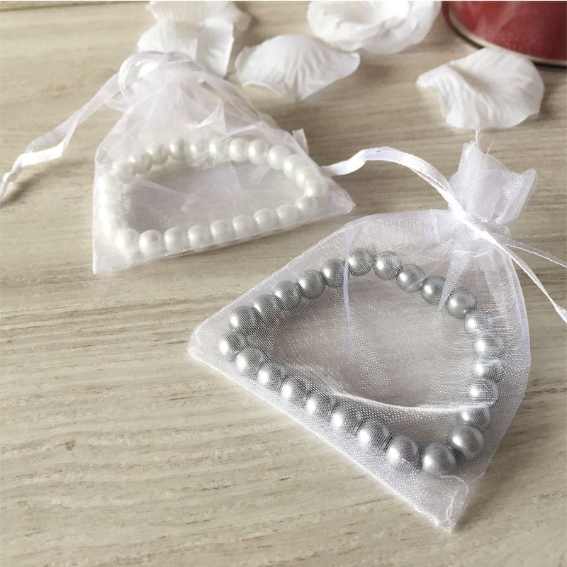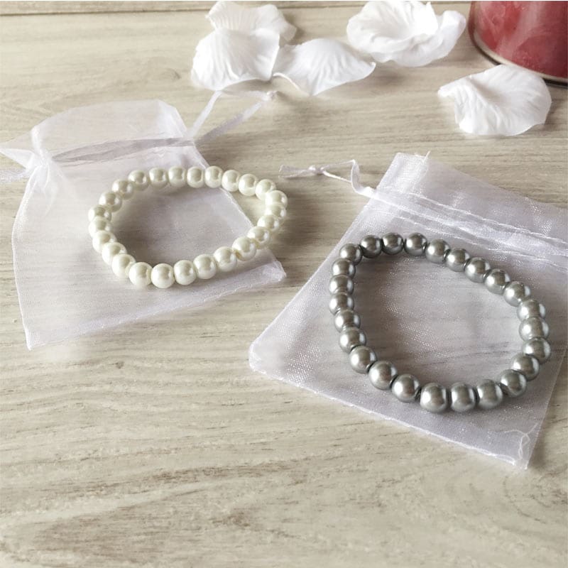Pulsera de perlas en 2 colores surtidos + bolsita de organza. Una sencilla pulsera presentada en bolsa de organza blanca para que no te preocupes de la presentación. La pulsera está fabricada con abalorios de perlas. Se envían surtidas en 2 colores distintos: Blanco y Plata. Es un detalle que puedes regalar a tus invitadas el día de tu boda y que acertarás por lo sencilla que es y por la presentación.