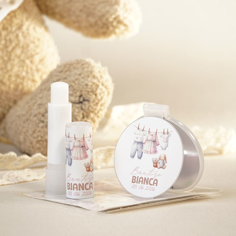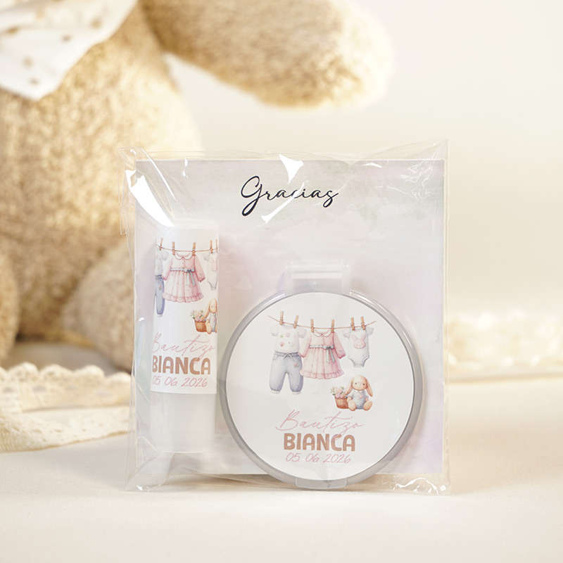 Este pack no es solo un recuerdo decorativo; es un obsequio funcional que tus invitadas podrán utilizar diariamente en su bolso, manteniendo el recuerdo de tu pequeña siempre presente.