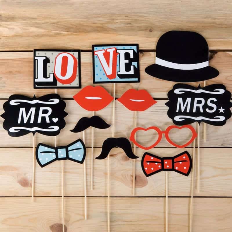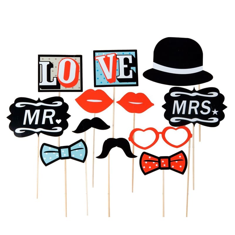 Bonito set de complementos de estilo vintage para el photocall de tu boda. Tus invitados se lo pasarán en grande con estos postizos. Imagina lo divertida que serán las fotos. Risas aseguradas! Incluyen 12 piezas.