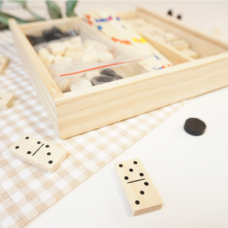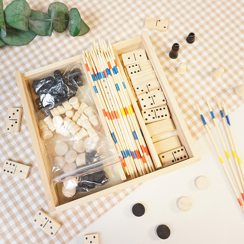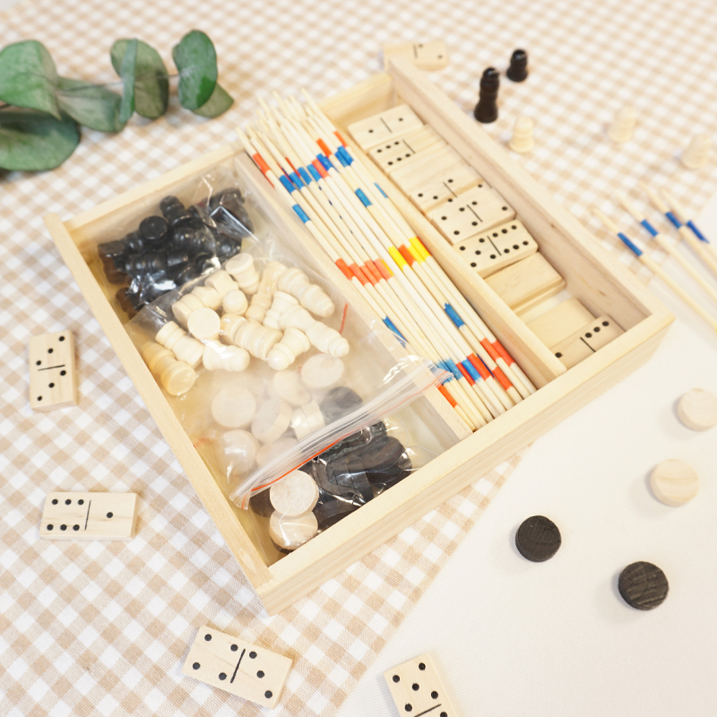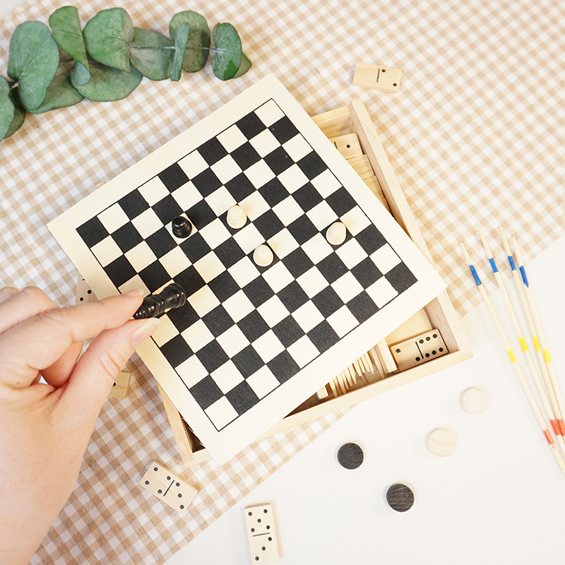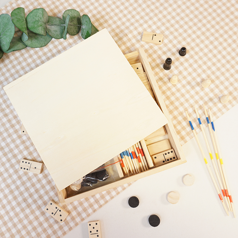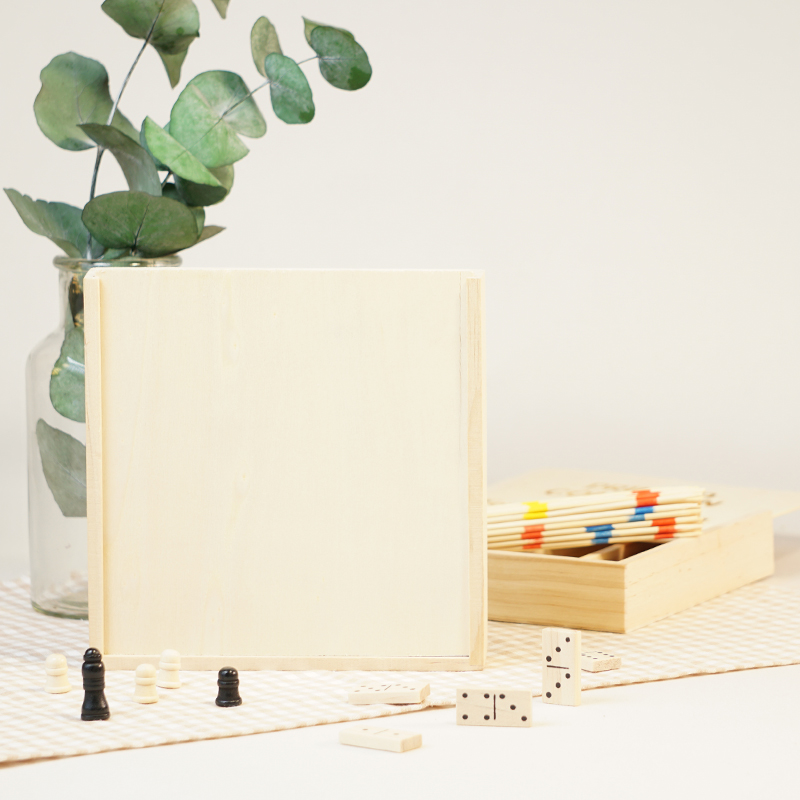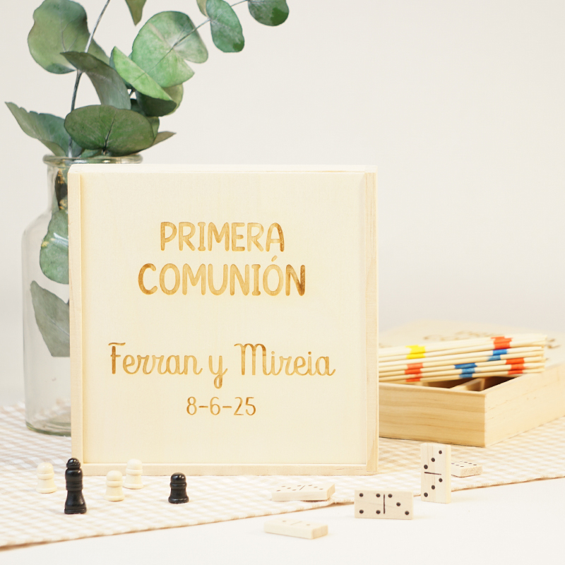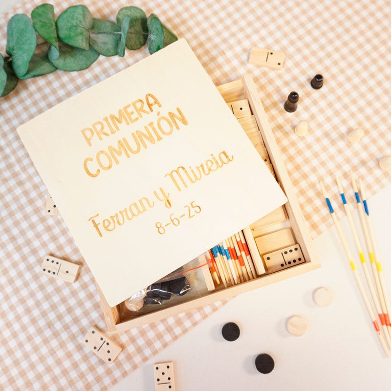 Divertido set de 4 juegos en madera. La tapa es un tablero por un lado y por el otro lisa, con opción de personalizarla con el nombre de tu peque. Los juegos son: mikado, ajedrez, damas y dominó. Todo un regalo para tus invitados más jugones.