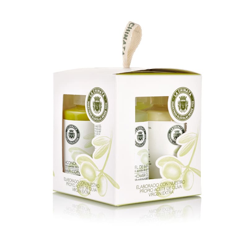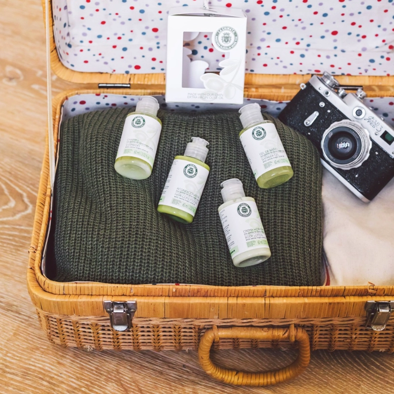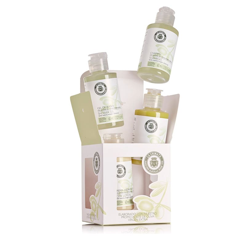 - Set de cosmética. Gel, hidratante, champú y acondicionador.