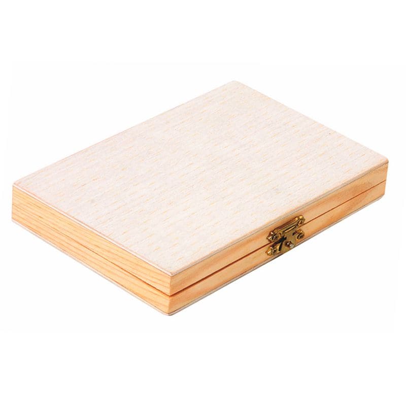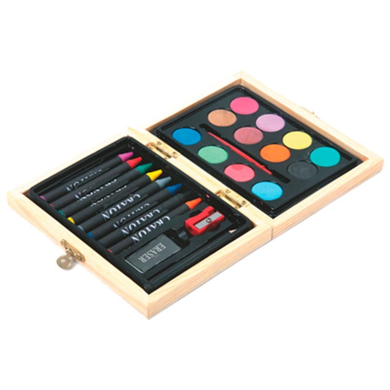 Set de pinturas en caja de madera, con 24 piezas: 12 acuarelas, 8 ceras, 1 lápiz, un pincel, 1 sacapuntas y una goma. Fabricado en madera natural. Ideal como detalle para los más peques.