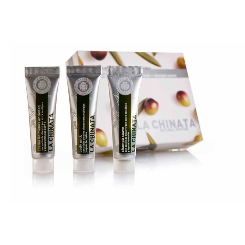- Set mini, body milk, champú y crema de manos. Incluye estuche.
