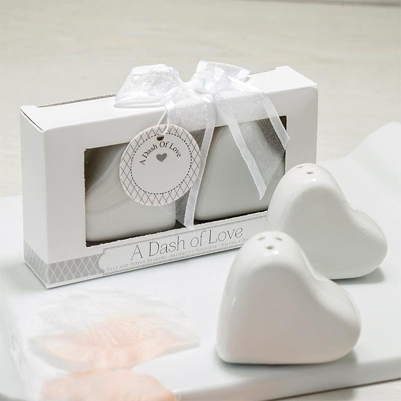 Nuevo salero y pimentero en forma de corazón. El precio es por el juego completo de 2 unidades. Viene en una bonita caja de presentación. La etiqueta que incluye no se puede personalizar. Es sin duda un bonito detalle de boda para tus invitados. Pueden usarlo día a día en su cocina para preparar los platos mas ricos.