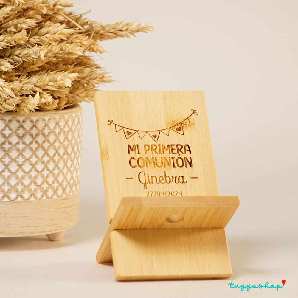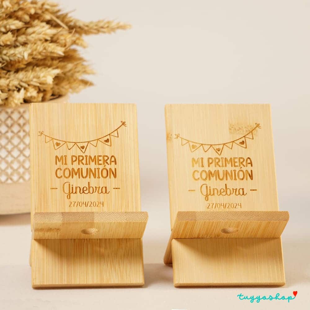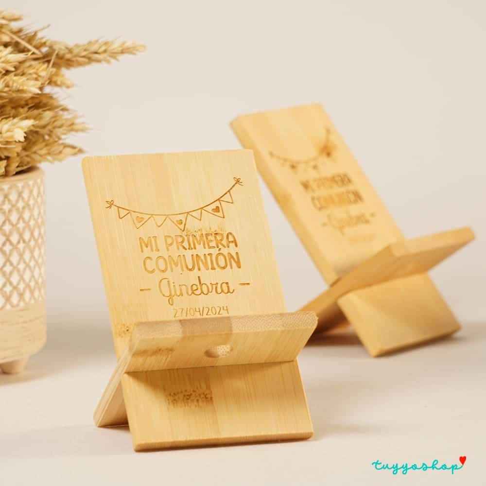 Este soporte de bambú para móviles personalizado con diseños de comunión es el regalo perfecto para tus invitados. Hecho de bambú sostenible, es una opción duradera y amigable con el medio ambiente. Además, el diseño personalizado de comunión lo convierte en un recuerdo especial y único para tus invitados para recordar su participación en tu gran día. No te pierdas la oportunidad de sorprender a tus invitados con este hermoso y funcional regalo. ¡Haz que tu comunión sea aún más especial con este soporte de bambú personalizado!