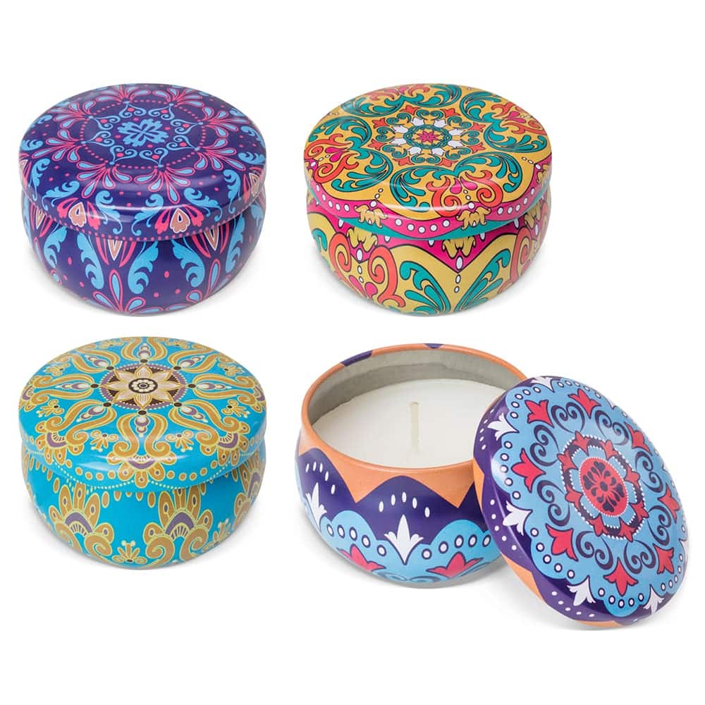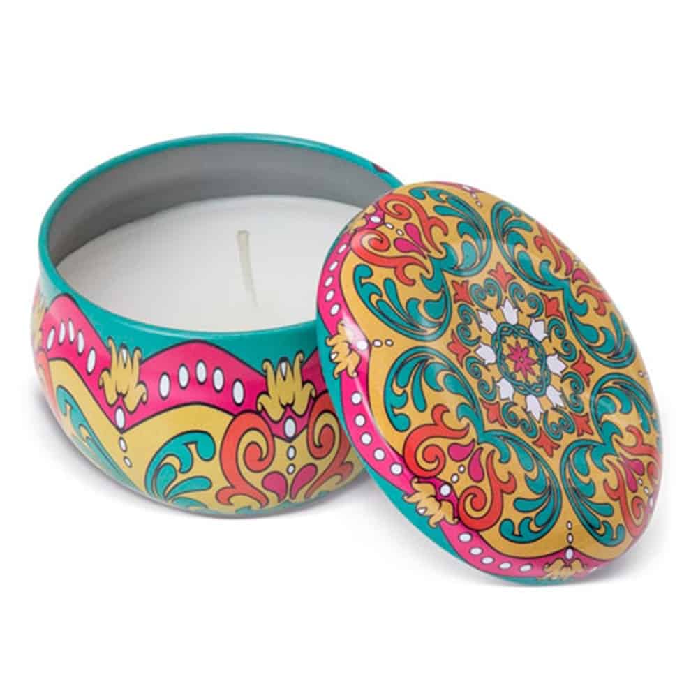 La nueva Vela aromática modelo Andalucía te encantará por sus llamativos estampados, además de por sus delicados aromas. Se envía surtida en 4 estampados y aromas: vainilla, gardenia, romero y lavanda. Una vez se haya terminado puedes utilizar su cajita metálica como joyero o para guardar pequeños objetos. Un regalo útil y bonito que seguro gustará a los invitados de tu evento.